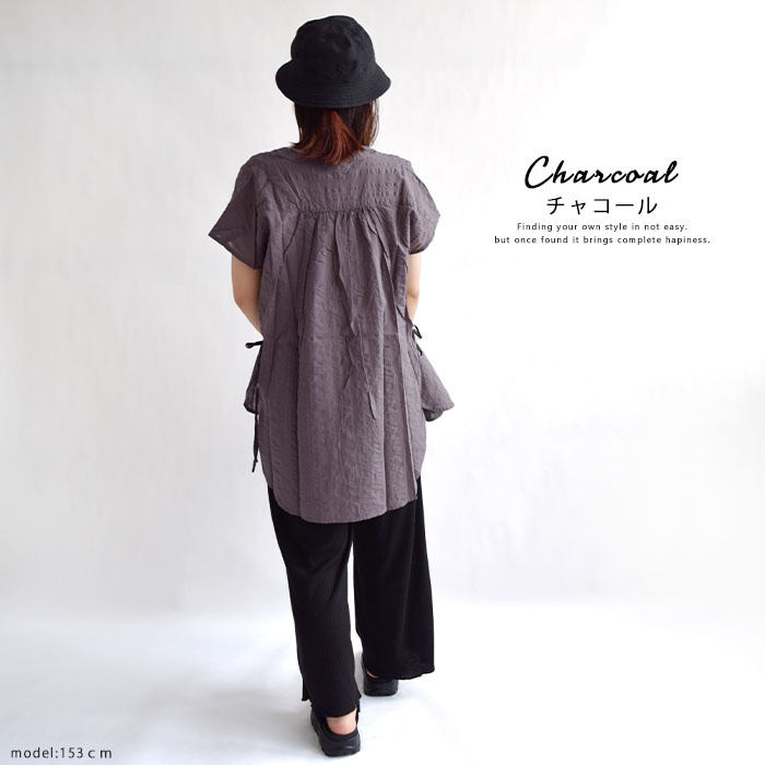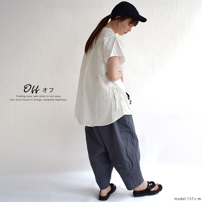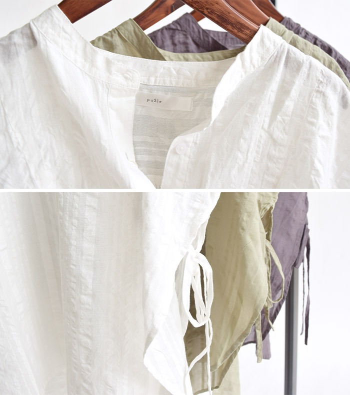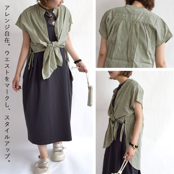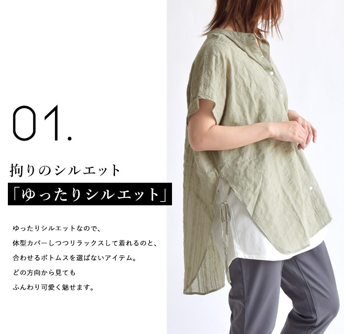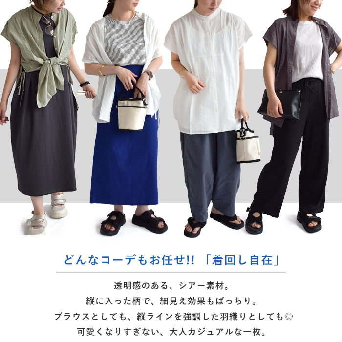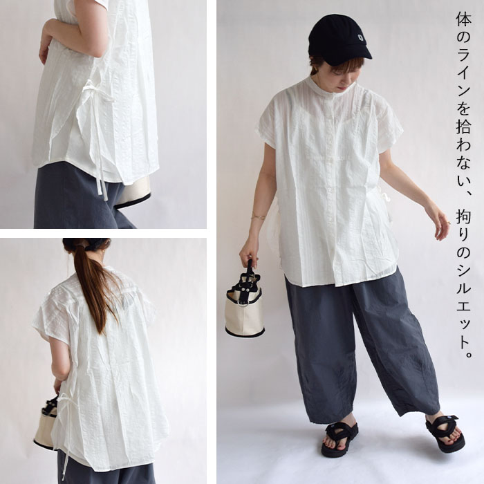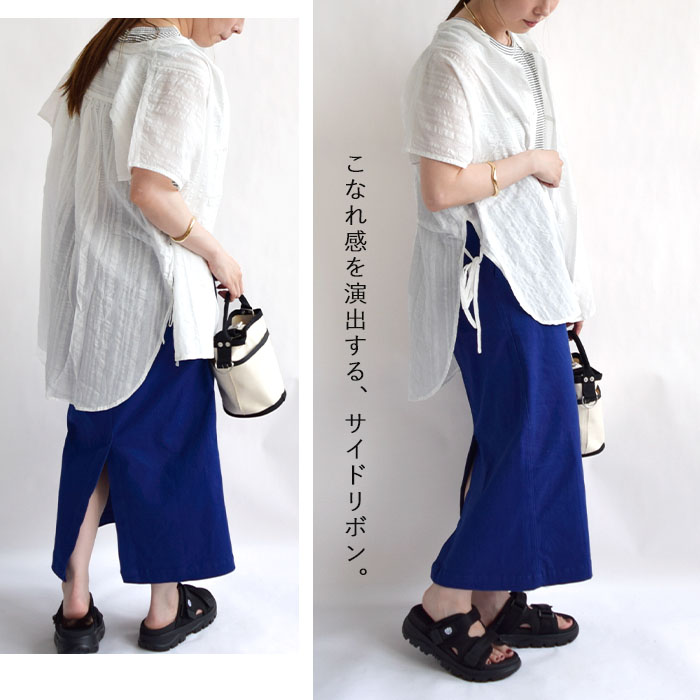 | 商品説明 | 今流行りのシアーシャツ。女性らしい丸みのある襟もと。サイドのリボンが大人かわいい女性を演出します。普段使いからオフィスまで使いやすい一枚です。ブラウスとしてだけでなく前ボタンを外して羽織りとしても着用可能です。 |