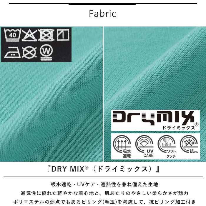 素材には、吸水速乾・UVケア・遮熱性を兼ね備えたDRY MIX生地を採用。汗をすばやく吸収し、蒸れやベタつきを抑えながら、アクティブなシーンにも対応します。