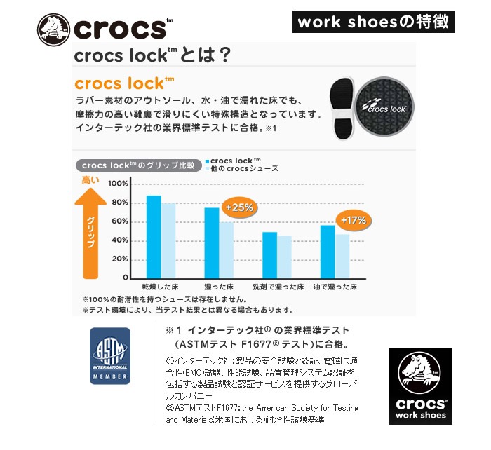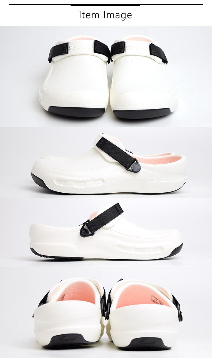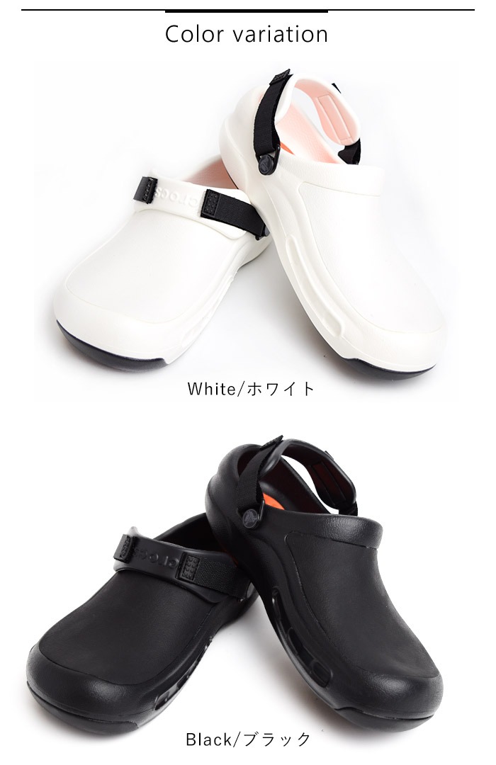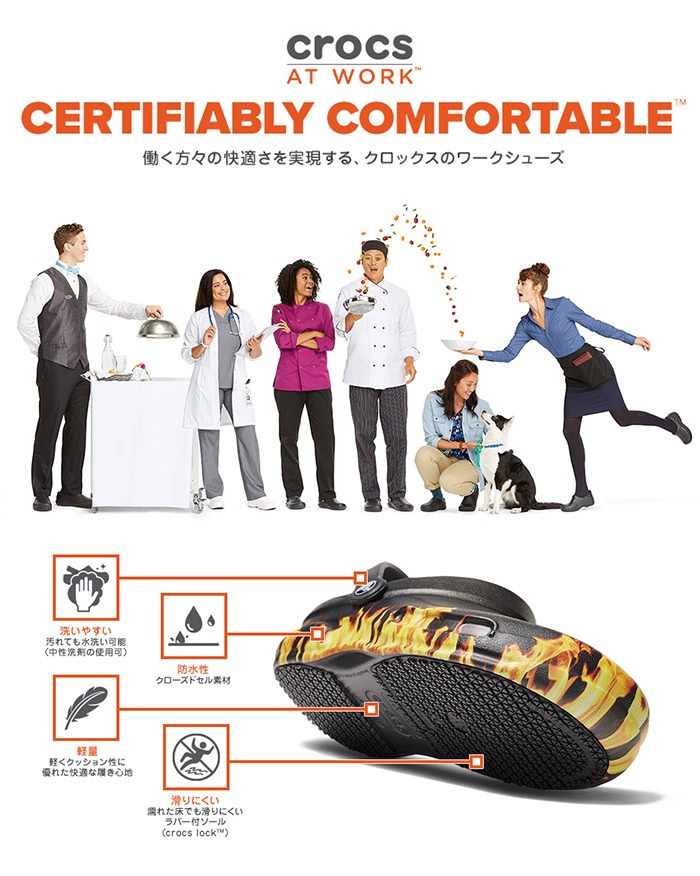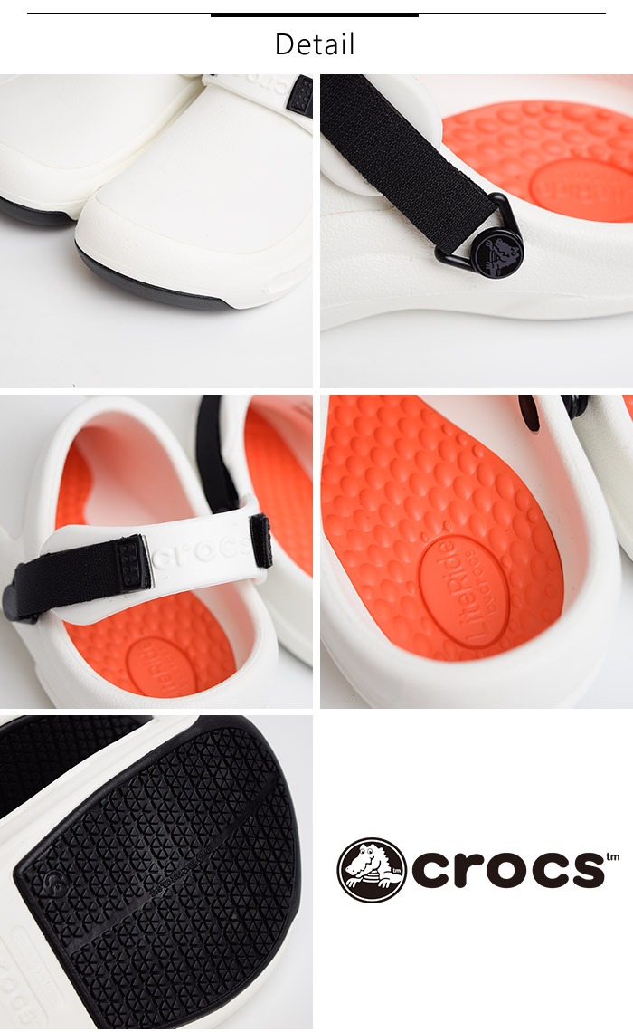 調理場で働く人々をサポートする定番モデル【bistro(ビストロ)】に新機能を追加したアップデートバージョンが登場。フットベッドに新素材の【ライトライド】を使用し、さらなる快適性を実現。ソールには革新的な【crocs lock】を採用し水、油などで濡れた床でも、摩擦力の高い靴裏で滑りにくい構造になっています。クローズドトゥデザインと厚みのあるアッパーが、調理器具の落下などから足を守ります。