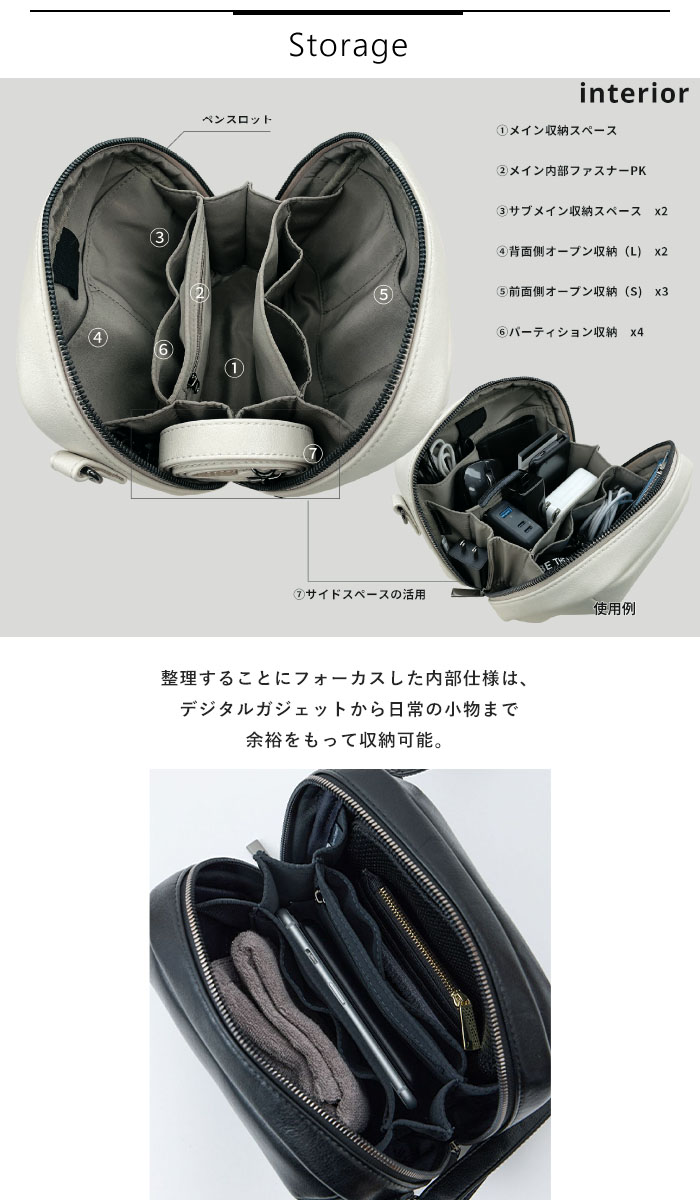 | 商品説明 | “手のひらサイズに、デザインと機能を凝縮” 整理することにフォーカスした内部仕様は、デジタルガジェットから日常の小物まで余裕をもって収納。 |