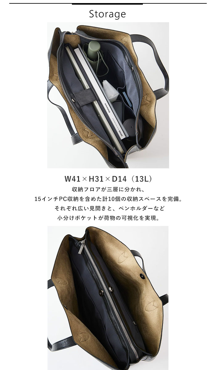 | 商品説明 | ビジネスでも普段使いでも活躍するトートバッグ。収納フロアが三層に分かれ、PC収納を含めた計10個の収納スペースを完備。 それぞれ広い見開きと小分けポケットが荷物の可視化を実現。レザーのような雰囲気でいて、より軽く肩への負担を軽減できる。 撥水性も高く15インチPC収納も。 |