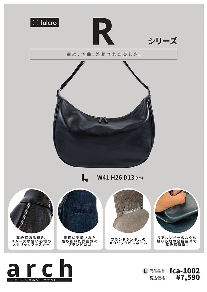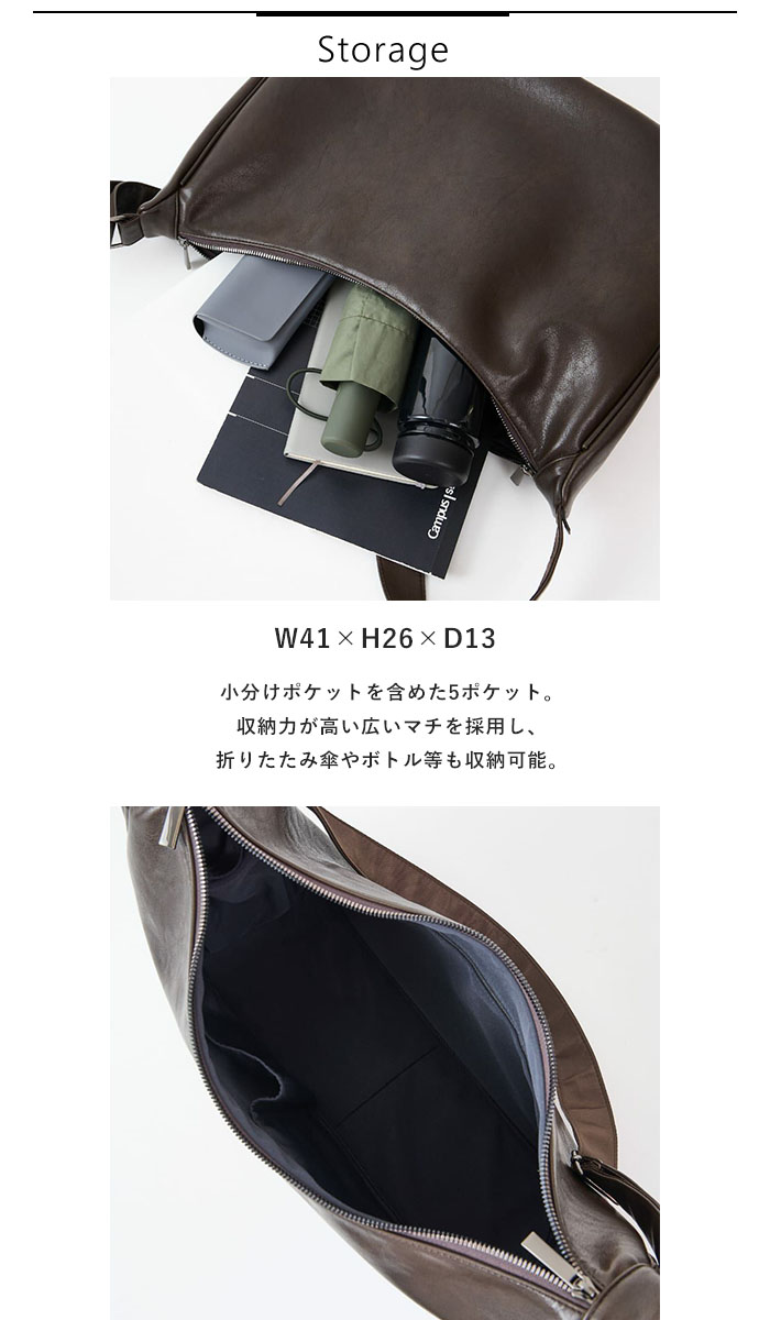 商品説明 バッグの持ち手から本体までの流れるようなラインデザインで、肩から掛けた時でも形を崩さず身体に美しくフィットする。 皮革のような雰囲気でいて撥水性が高くシーンを選ばない。 マチが広いことで収納力が高く、自立する設計になっているので使用していない時でも存在感を発揮する。