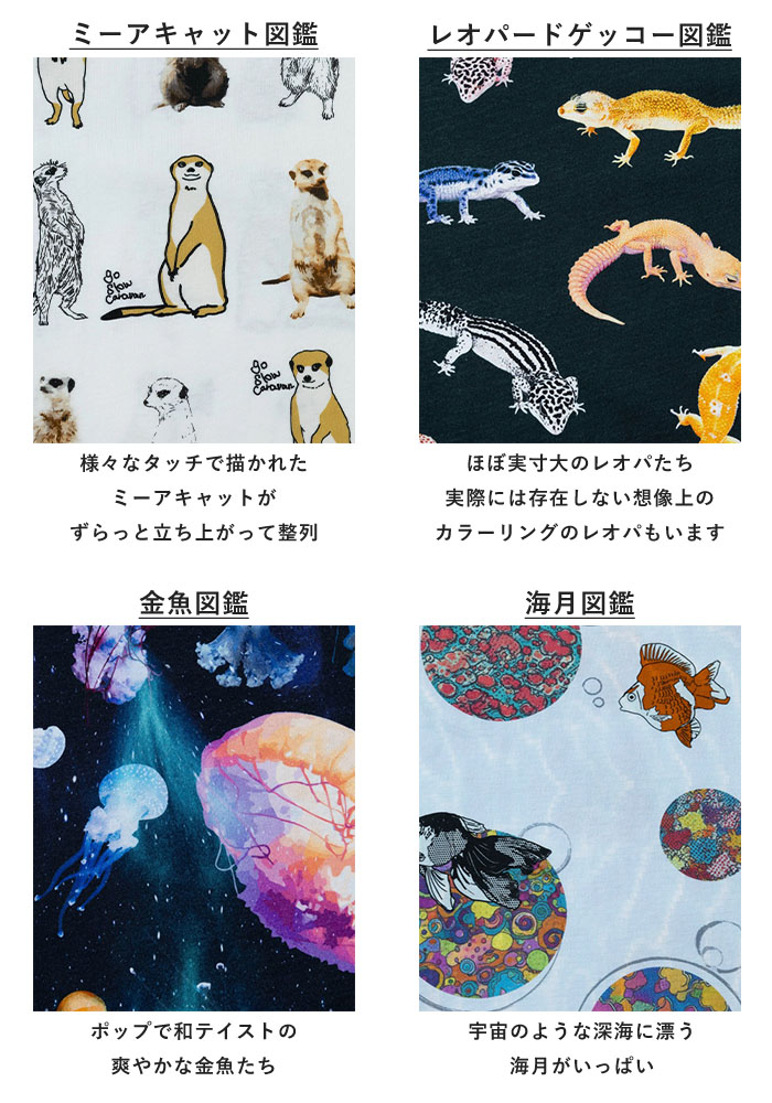 ボディの生地は、程よい張り感と油分が少なくカラッとした肌触り、固めの質感が特徴の定番USACOTTON天竺を使用。 ・000/ミーアキャット図鑑 ・049/レオパードゲッコー図鑑 ・060/金魚図鑑 ・064/海月図鑑 |