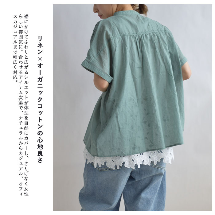 | 商品説明 | 60番手の細番手糸を使用した、リネンとオーガニックコットンのブレンド素材。 通気性の良さとさらりとした肌触りを兼ね備え、蒸し暑い時季にも心地よく着用いただけます。 ほんのりとしたハリ感とナチュラルなシボ感が相まって、洗いざらしでも様になる素材感に 胸元と肩まわりにあしらわれたシャーリングデザインが、やさしい立体感を生み出し、 引き立てます。 おすすめのスタイリングは、花柄スカートなどの柄アイテムと合わせてフェミニンに |