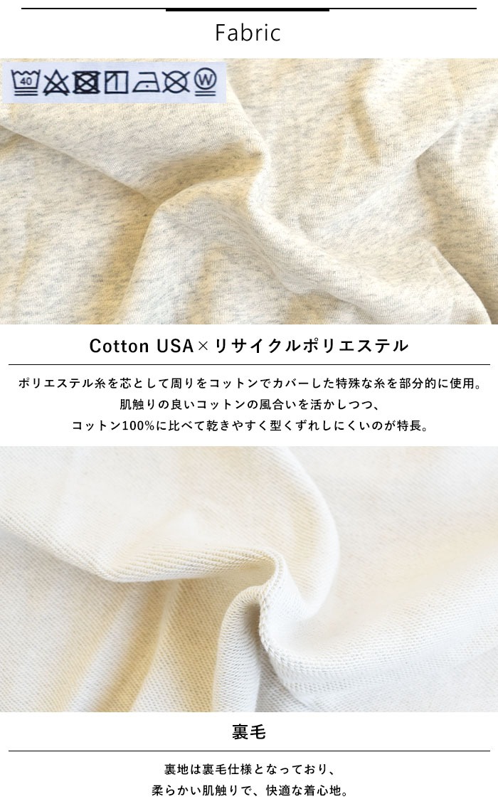 ポリエステル糸を芯としてその周りをコットンでカバーする特殊な糸を部分的に使用。肌触りの良いコットンの風合いを活かしつつ、コットン100%に比べて乾きやすく型くずれしにくいのが特長です。