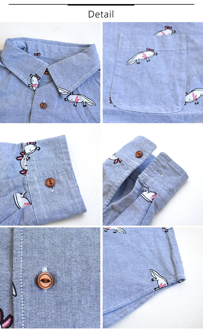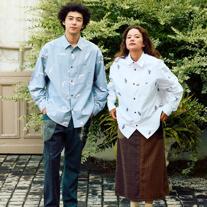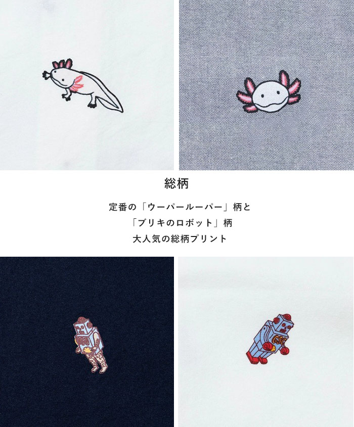 ユニセックスで着回せるふんわり丸みのあるシルエット。 定番のウーパールーパーに加え、新柄のブリキのロボット柄が新たに仲間入り。 |