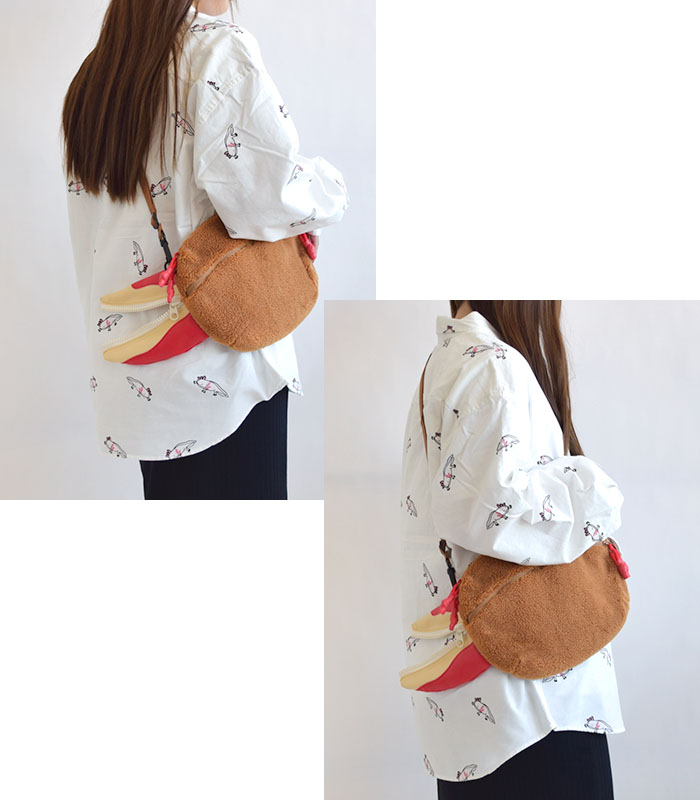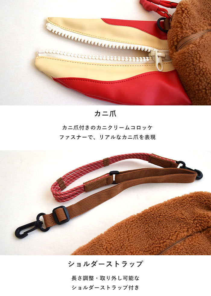 | 商品説明 | カニ肉とクリームソース(ホワイトソース)を具にしたコロッケ「カニクリームコロッケ」のショルダーバッグ。
