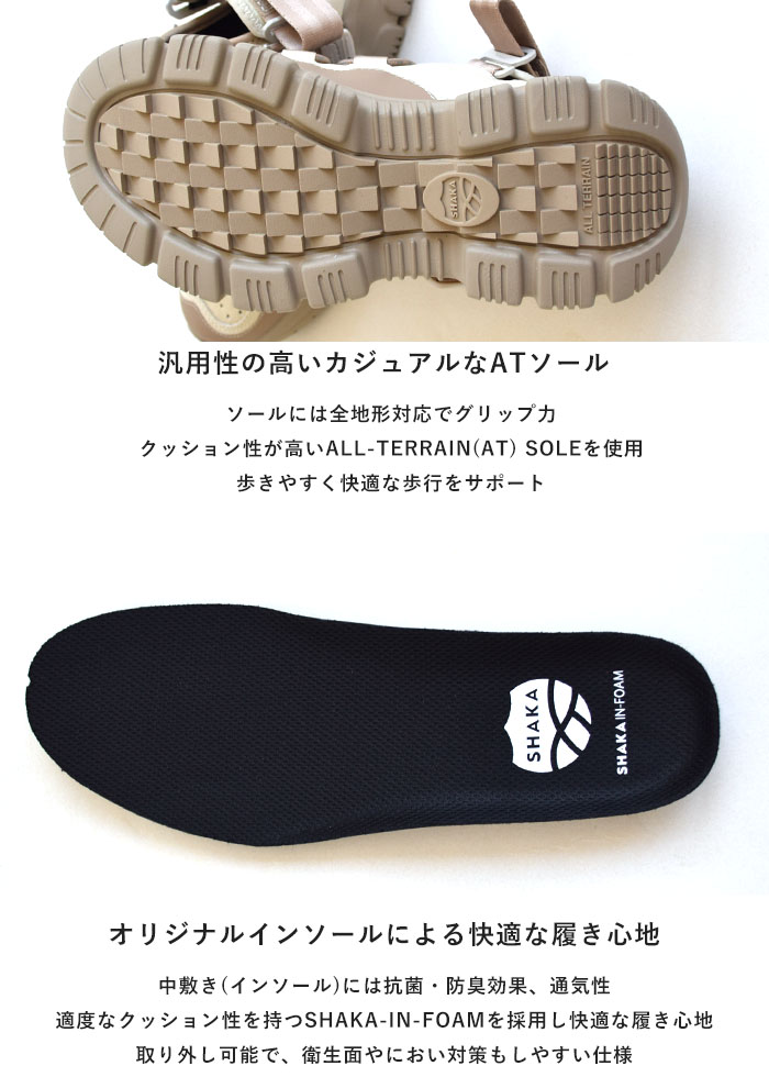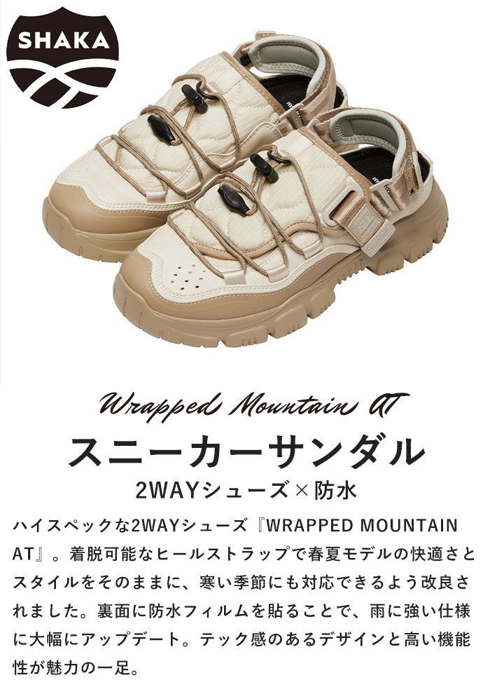 | 商品説明 | SHAKA(シャカ)の春夏人気モデル「TABLE MOUNTAIN AT」を秋冬シーズン向けにアップデートした、ハイスペックな2WAYシューズ『WRAPPED MOUNTAIN AT(ラップド マウンテン AT)』。着脱可能なヒールストラップで春夏モデルの快適さとスタイルをそのままに、寒い季節にも対応できるよう改良されました。