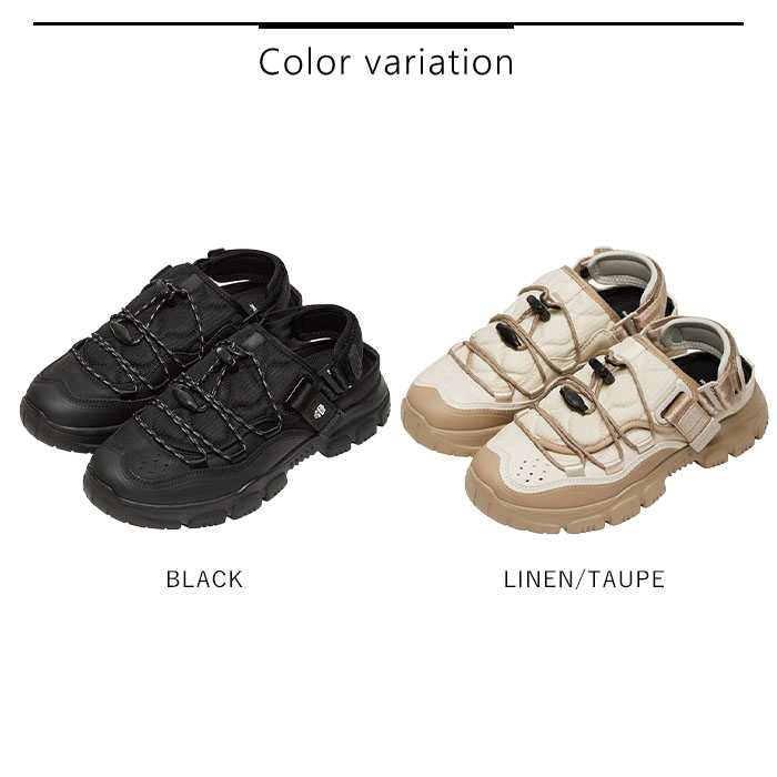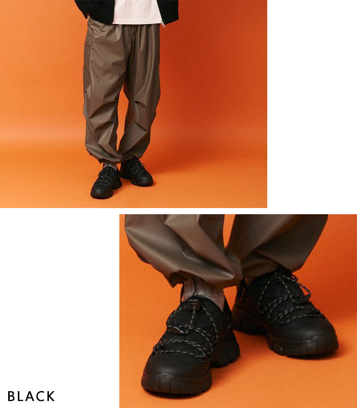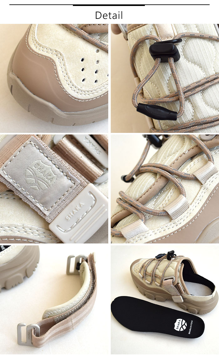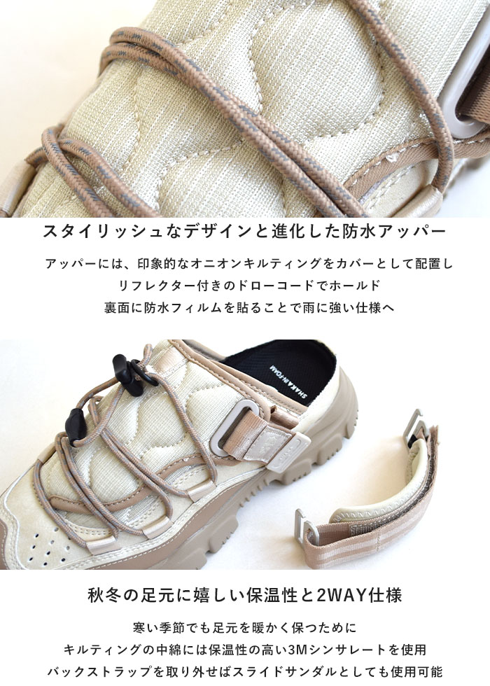 2025年秋冬モデルでは、アッパーのリップストップ素材を変更し、裏面に防水フィルムを貼ることで、雨に強い仕様に大幅にアップデート。テック感のあるデザインと高い機能性が魅力の一足です。アウトドアシーンでもタウンユースでも大活躍する、SHAKAの新作2WAYシューズで、快適な秋冬ファッションをお楽しみください。 |